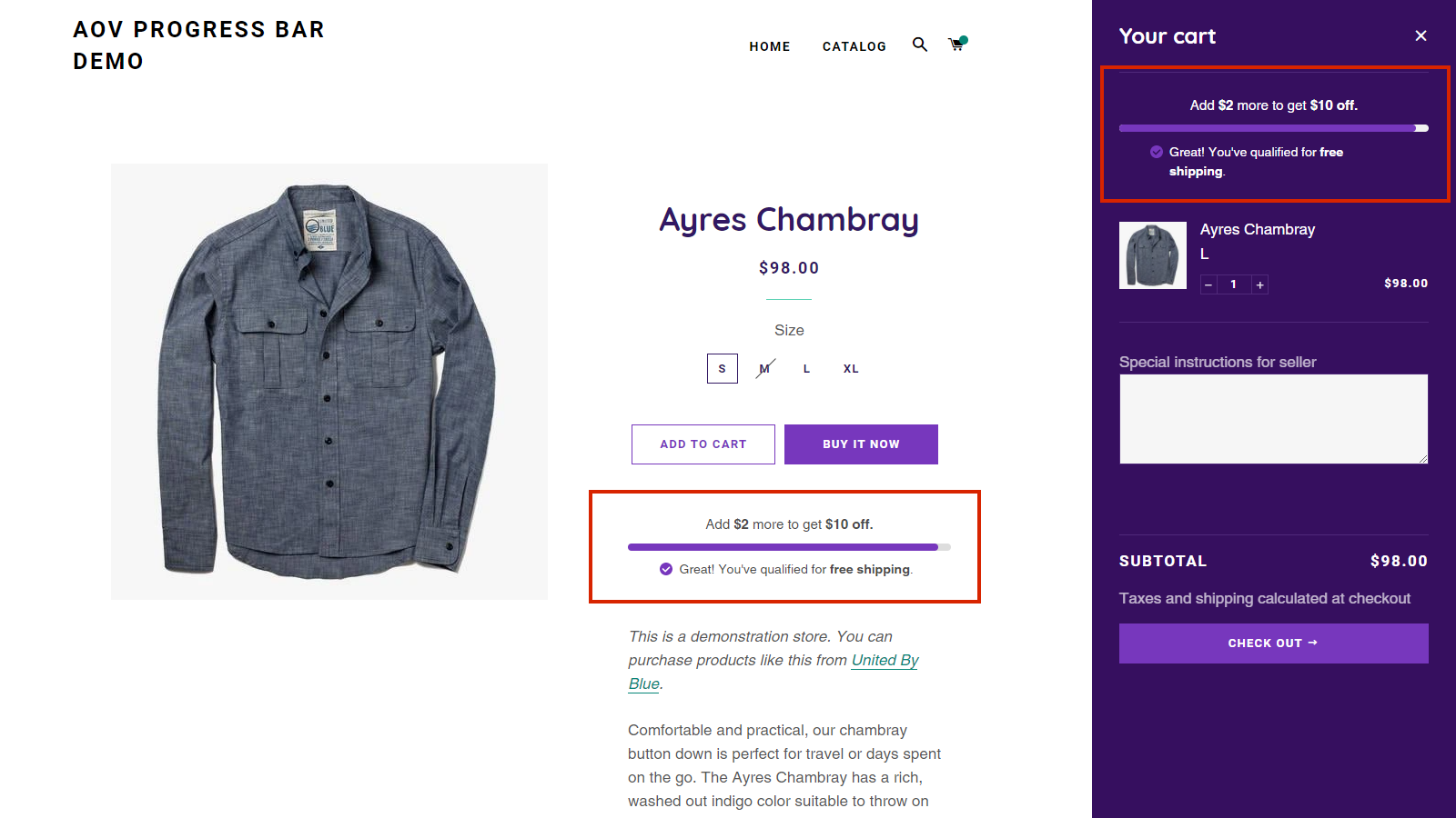 AOV Progress Bar is an interactive progress bar that changes whenever customers add or remove items from cart. This motivates customers to subconsciously add more items to their cart in order to qualify for discounts.